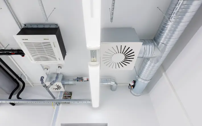 許多項(xiàng)目都傾向于選擇第三種方式。但需要注意的是,這種布局方式會(huì)減少下方上技術(shù)夾層(靜壓箱)的高度。為了確??諝饬鲃?dòng)的穩(wěn)定性和日后的FFU日常維護(hù),必須保持一定的凈高。根據(jù)合潔科技電子潔凈工程師的建議,最小的凈高應(yīng)為1.5米。