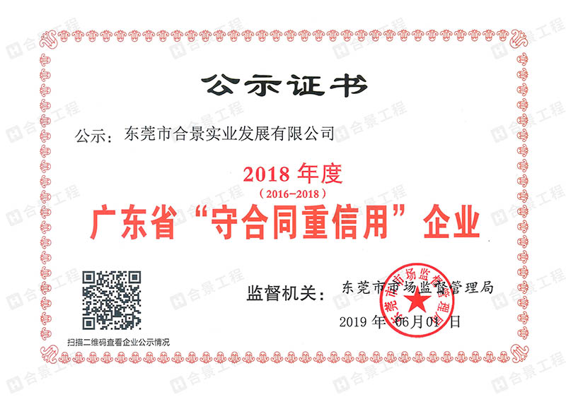 近日,廣東省市場(chǎng)監(jiān)督管理局公示了2018年度“守合同重信用”企業(yè)榜單,合景實(shí)業(yè)憑借良好的信用體系建設(shè)和誠(chéng)實(shí)守信的企業(yè)形象,連續(xù)3年被授予“廣東省守合同重信用企業(yè)”的榮譽(yù)稱號(hào)。